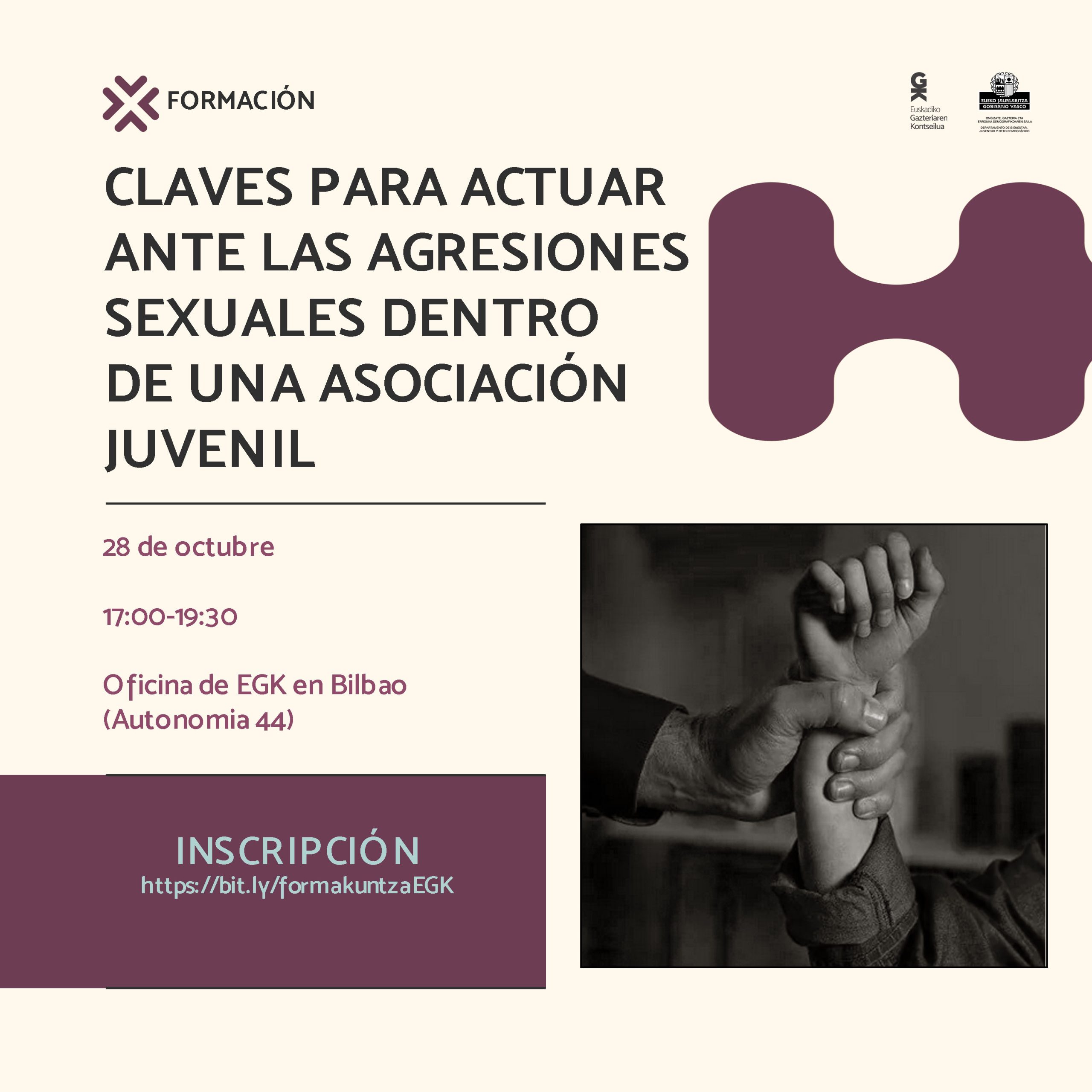 El 28 de octubre, de 17:00 a 19:30, en la oficina de EGK en Bilbao (Calle Autonomía, 44 bajo), se ha organizado una formación para trabajar las claves de actuación ante posibles agresiones sexuales en una asociación juvenil.