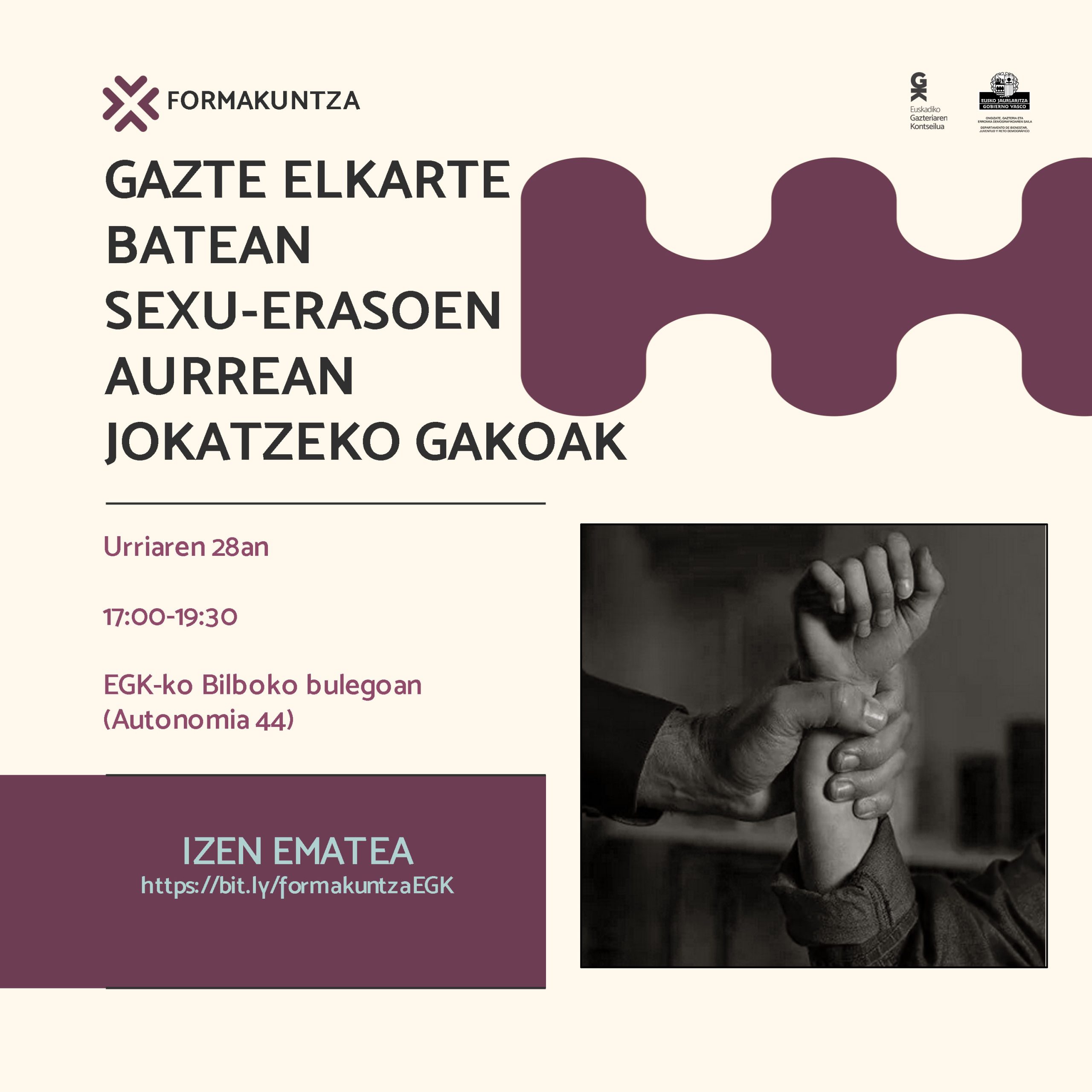 Urriaren 28an, 17:00etatik 19:30etara, Bilboko EGK-ko bulegoan (Autonomia kalea, 44 zb, behea.) gazte elkarte batean gertatu daitezken sexu erasoen aurrean jarduteko gakoak lantzeko formakuntza bat antolatu da.