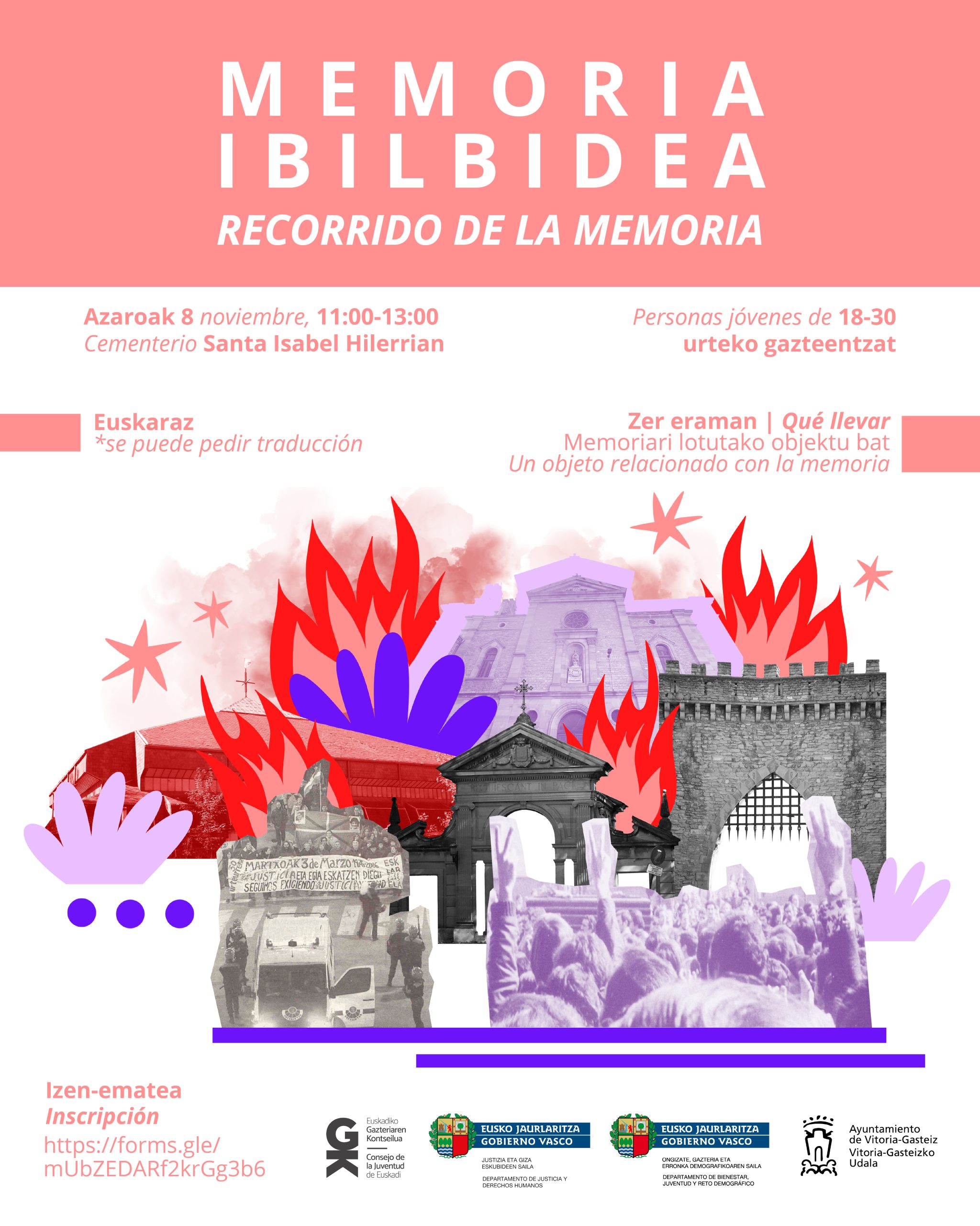 Azaroaren 8an Memoriaren Ibilbidea egingo dugu, Euskadiko Gazteriaren Kontseiluak (EGK) Gasteizko Udalarekin lankidetzan 18 eta 30 urte bitarteko gazteentzat antolatutako jarduera: ibilaldi parte-hartzailea, gure hiriko leku sinbolikoetan zehar, motibazio politikoko indarkeriaren inguruan hausnartzeko. Gazteok aukera izango dugu gure ikuspuntua emateko, galderak egiteko eta emozionalki konektatzeko.