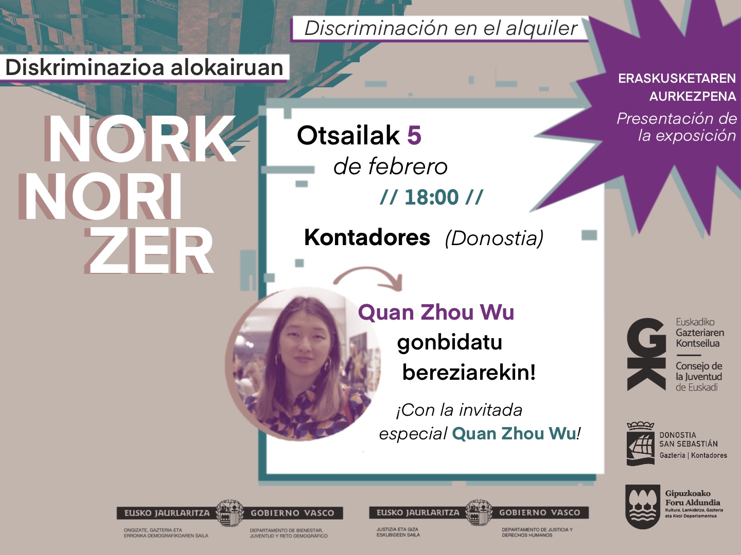 Testuinguru horretan, otsailaren 5ean, 18:00etan, Kontadoresen (Donostia) “Nork-Nori-Zer: diskriminazioa alokairuan” proiektuaren aurkezpena egingo da. Ekimen horren helburua da artearen eta hausnarketa sozialaren bidez etxebizitza lortzeko praktika diskriminatzaileak ikusaraztea, aztertzea eta horiei aurre egitea.